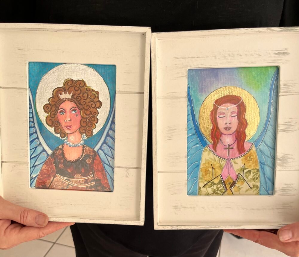 Medium – Watercolours, Ink and Gold Leaf Size – Framed in a lovely white frame (H) 25 cm x (W) 20 cm Description –Angel of Faith, this painting has a personal channelled message on the back for the buyer. FREE Australia wide shipping
