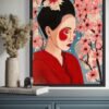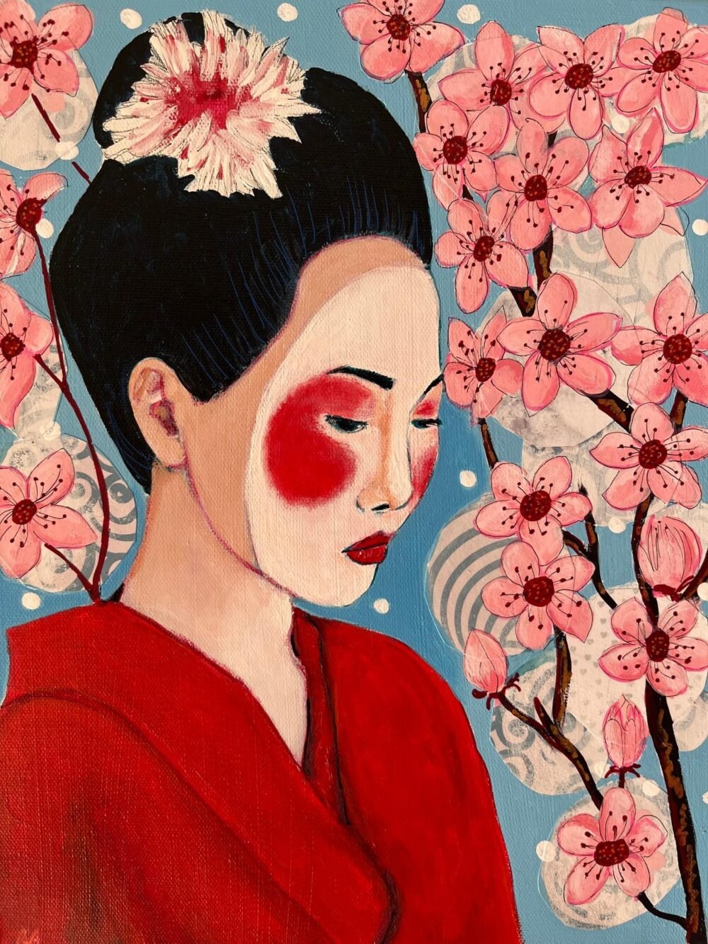Medium –Mixed media – Acrylics, collage on canvas Size – Framed in black Floating frame H38. 2 x W 30.8cm Description – Japanese Geisha girl, please note this is part of a pair, the other painting that goes with it is Bombay in Japan.