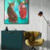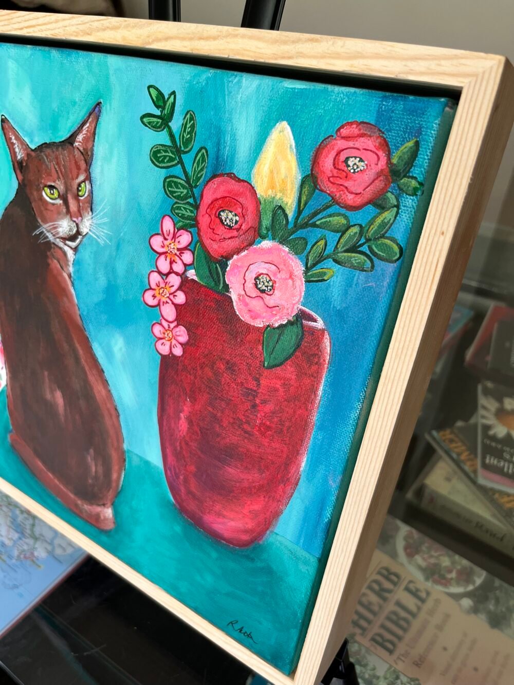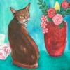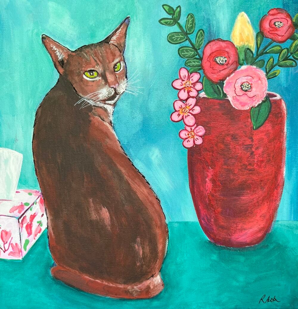 Medium –Acrylics on Canvas Size – Framed in white Floating frame H 33.4 x W 33.4 cm Description – Hazel my Abyssinian cat by the red vase